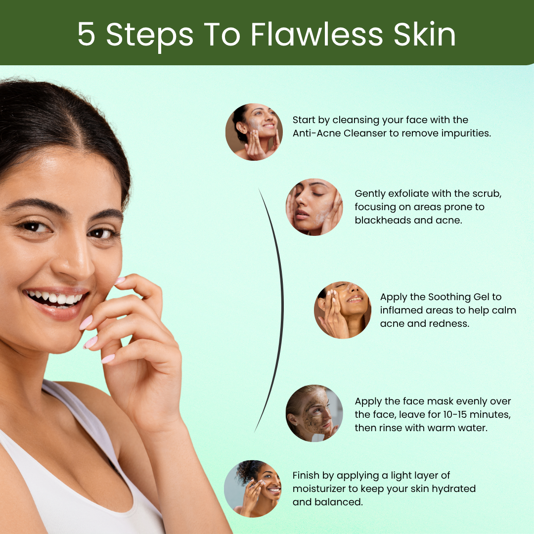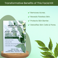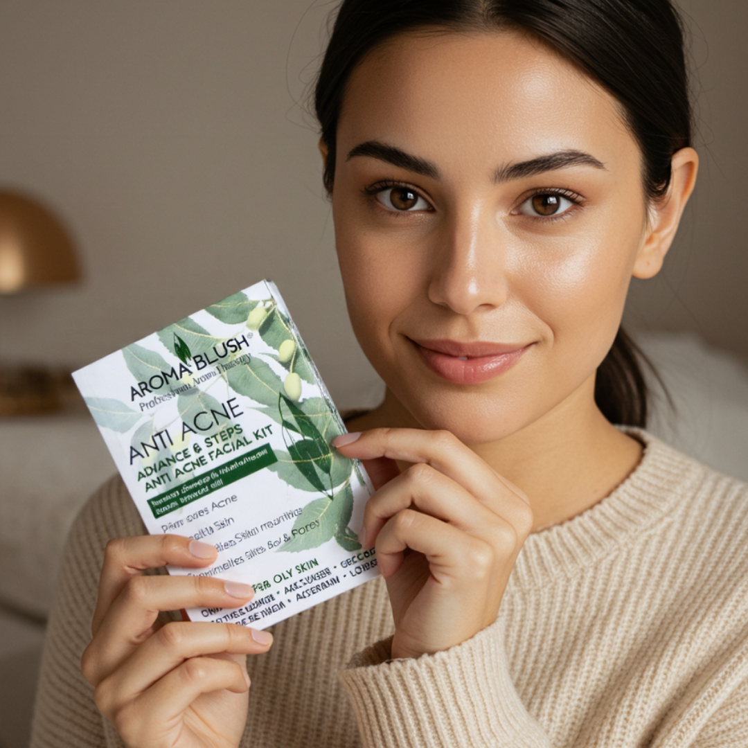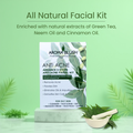 Aromablush Anti-Acne Facial Kit is an all-in-one solution designed to deeply cleanse, clarify, and balance acne-prone skin. Infused with potent natural ingredients like Neem, Tulsi, Cinnamon, Tea Tree Oil, Green Tea Extract, and Basil Oil, this kit targets acne, reduces excess oil, and soothes inflammation while restoring your skin’s natural radiance. Treat yourself to a spa-like experience that fights acne and promotes clear, healthy skin with this carefully crafted facial kit.