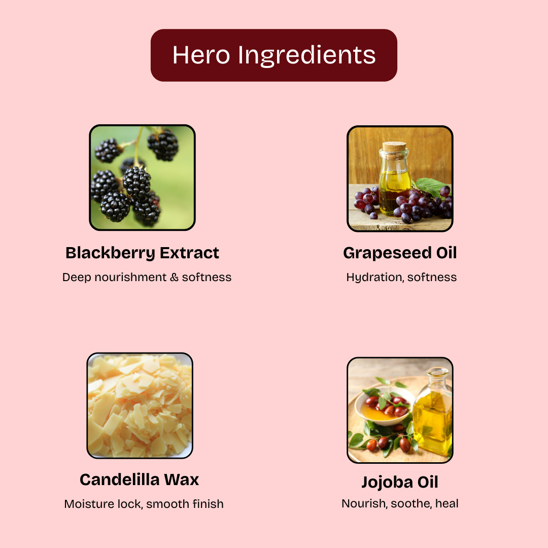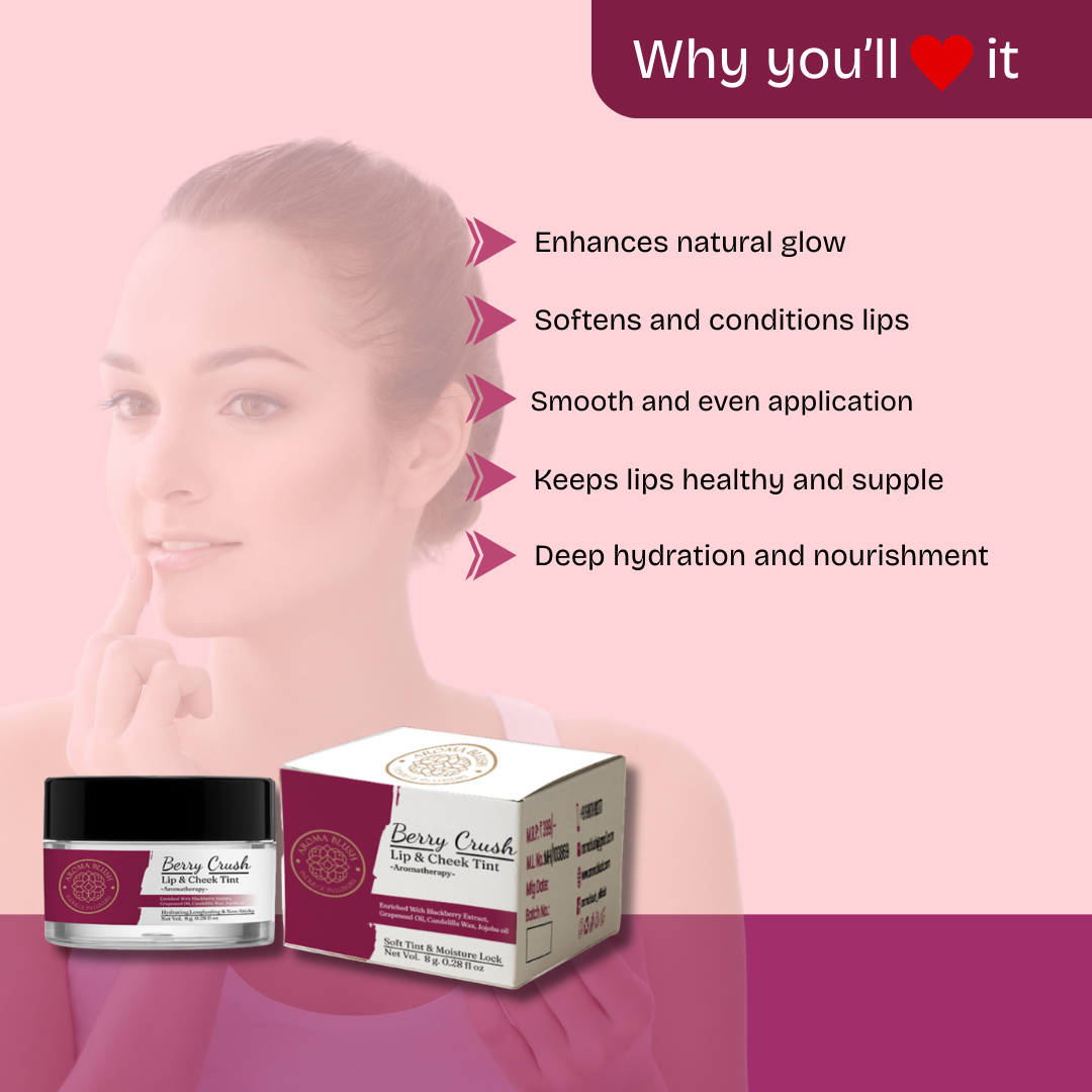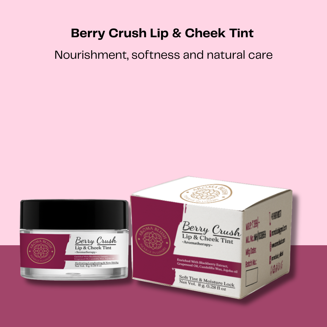Pop of Berry Glow, Naturally! – AROMABLUSH Berry Crush Lip & Cheek Tint gives your lips and cheeks a fresh, dewy flush with the goodness of skincare. Powered by juicy blackberry extract, nourishing grapeseed oil, moisturizing jojoba oil, and plant-based candelilla wax, it blends seamlessly for a healthy, long-lasting tint.Why Choose AROMABLUSH?