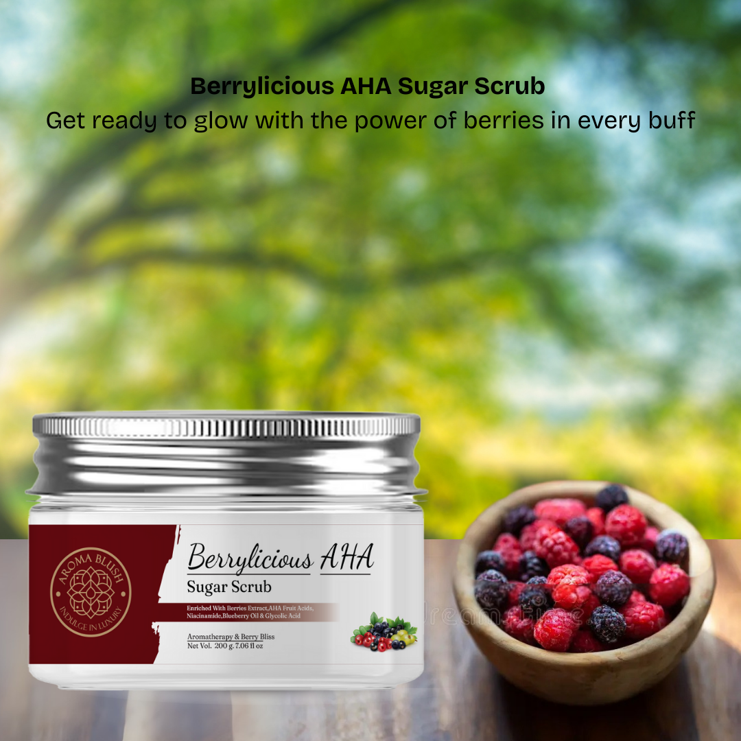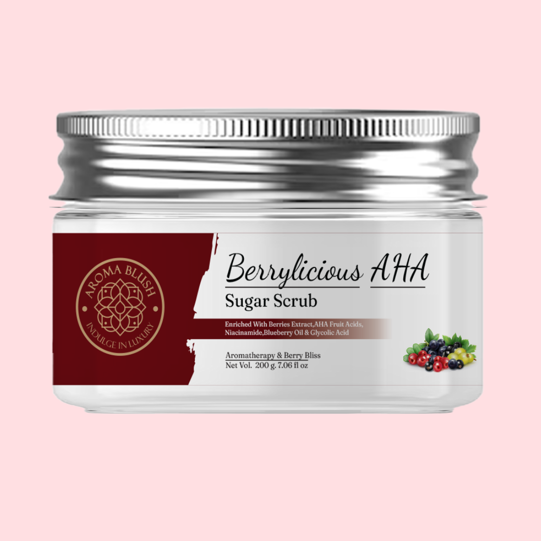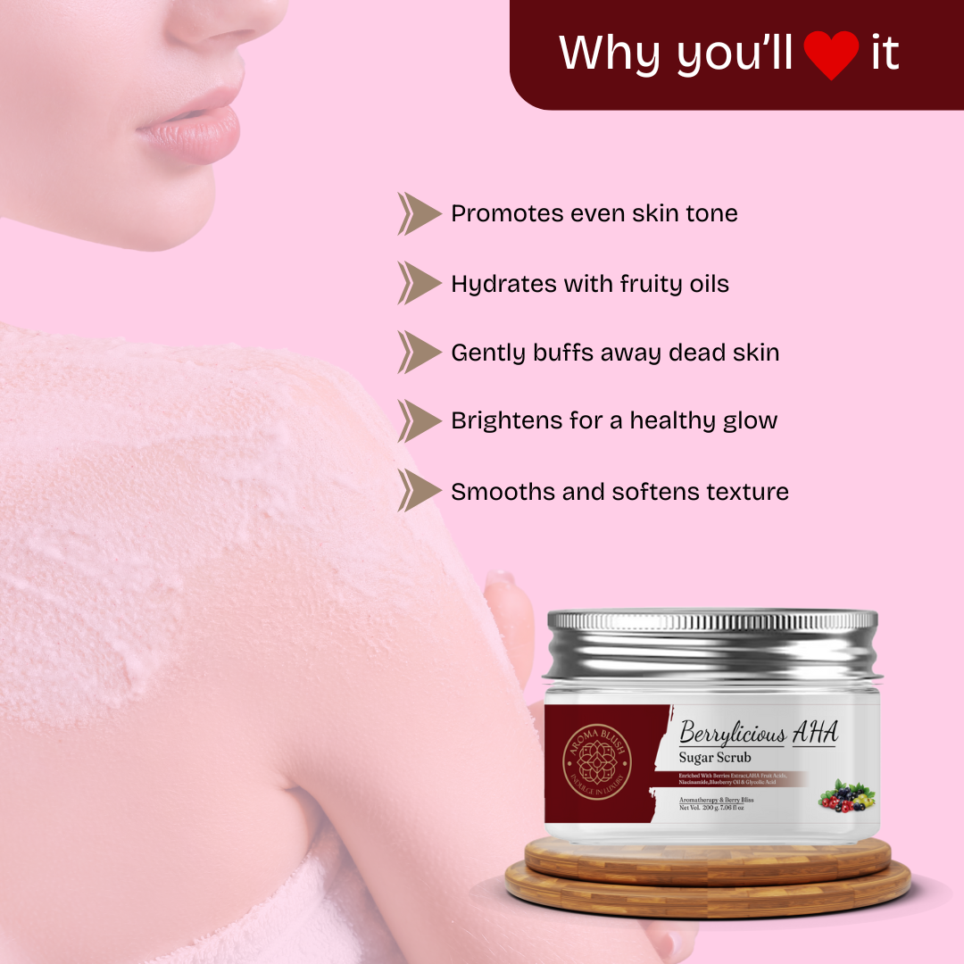 AROMABLUSH Berrylicious AHA Sugar Scrub | Enriched with AHA Fruit Acids, Berry Extracts, Niacinamide, Blueberry Oil & Glycolic Acid