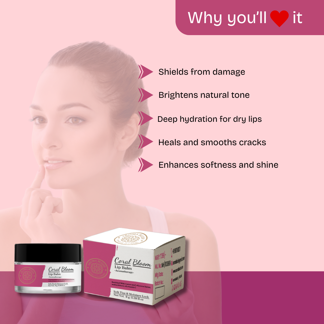 Bring life back to dry, dull lips with AROMABLUSH Coral Bloom Lip Balm – a nutrient-rich formula that nourishes, repairs, and enhances lip health. This lip balm blends carrot seed oil for healing and pigmentation care, cocoa butter for deep conditioning, sea buckthorn oil for its omega-rich rejuvenation, and vitamin C to boost brightness and protect against environmental stress.