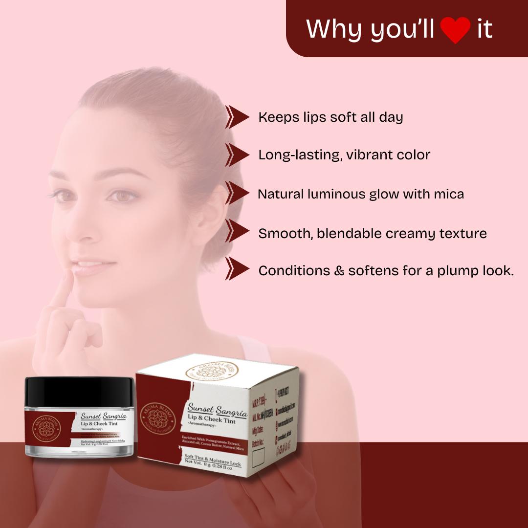 Sunset Glow in Every Swipe! – AROMABLUSH Sunset Sangria Lip & Cheek Tint gives your lips and cheeks a warm, radiant flush inspired by a glowing sunset. Infused with antioxidant-rich pomegranate extract, nourishing almond oil, creamy cocoa butter, and natural mica for a subtle shimmer, it delivers color and care in one swipe.Why Choose AROMABLUSH?