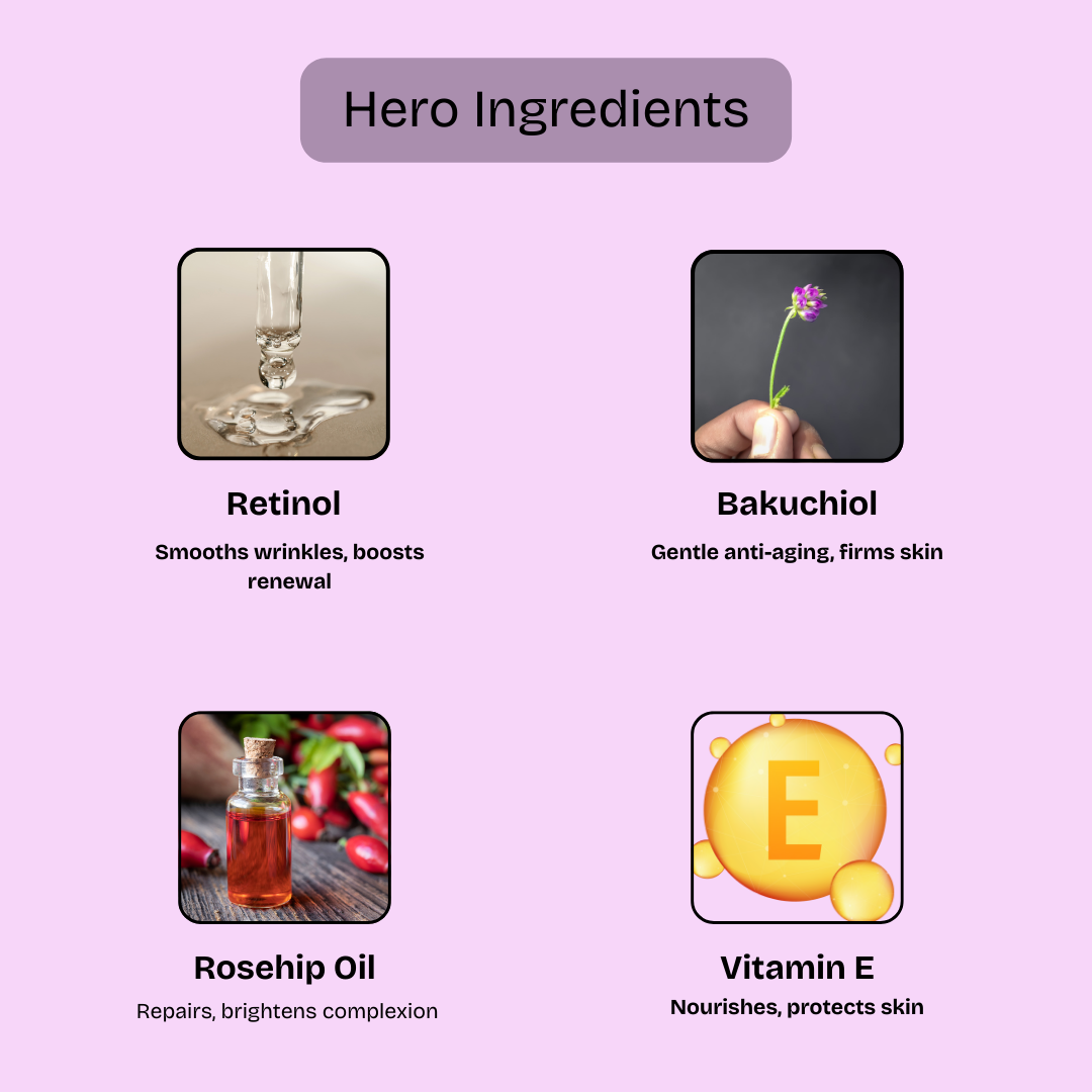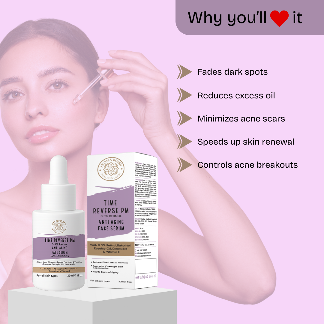 Turn back the clock on your skin with Aromablush Time Reverse PM Face Serum a powerful night treatment formulated to fight fine lines, wrinkles, and uneven texture. Enriched with 0.3% Retinol and Bakuchiol (plant-based retinol) for gentle yet effective renewal, Rosehip Oil for nourishment, Ceramides for barrier repair, and Vitamin E for antioxidant protection, this serum works while you sleep to reveal firmer, smoother, and youthful-looking skin.
