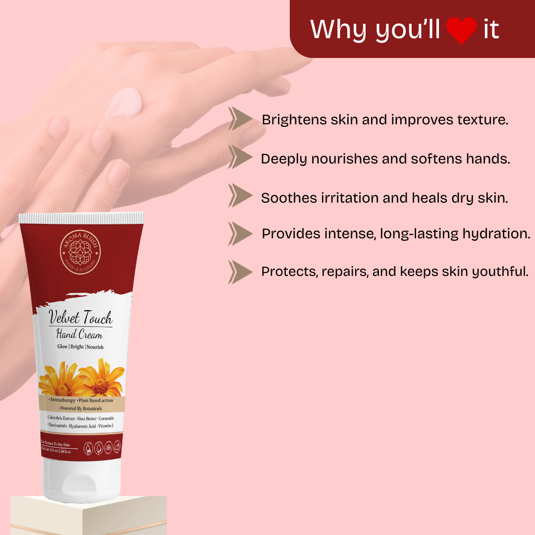 Soft, smooth, and hydrated hands enriched with skin-loving actives and long-lasting protection.Pamper your hands with AROMABLUSH Velvet Touch Hand Cream, crafted to hydrate, repair, and protect your skin. This luxurious formula combines Calendula extract to calm and heal, Shea Butter for deep nourishment, and Ceramides to reinforce the skin’s natural barrier. Niacinamide and Vitamin E brighten and protect, while Hyaluronic Acid ensures lasting hydration.
