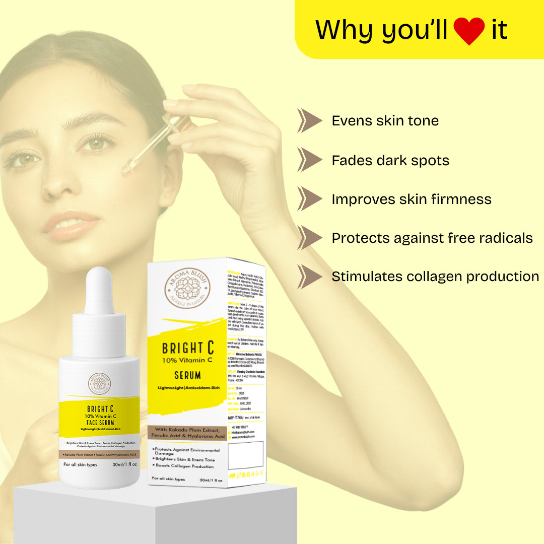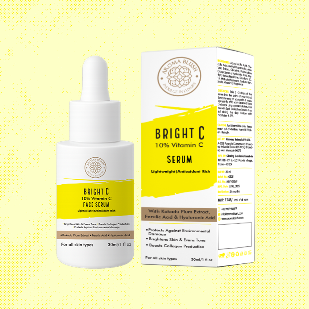 Unveil your skin’s natural radiance with Aromablush Bright C 10% Vitamin C Face Serum. Powered with 10% Vitamin C, this lightweight serum targets dullness, uneven tone, fine lines, and pigmentation while protecting skin from environmental damage. Enriched with Hyaluronic Acid, Aloe Vera Extract & Vitamin E, it delivers deep hydration, soothes irritation, and boosts collagen for youthful, glowing skin. Who is it for?