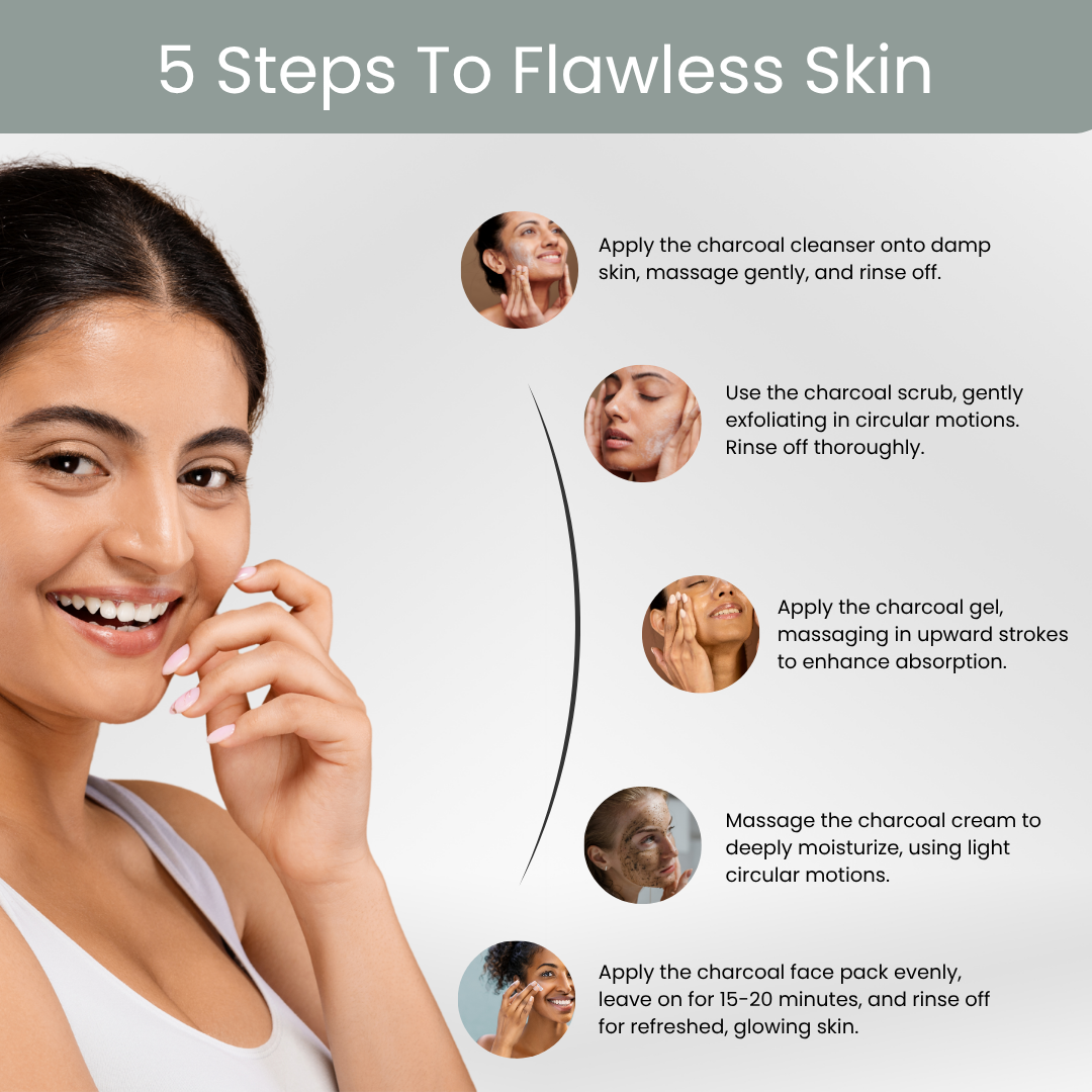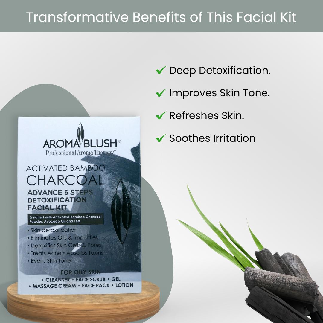 Revive your skin from daily pollution, oil buildup, and dullness with the AromaBlush Activated Bamboo Charcoal Facial Kit—a 6-step detoxifying facial treatment enriched with Activated Bamboo Charcoal, Avocado Oil, and Tea Extract.