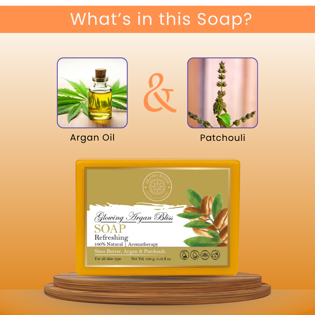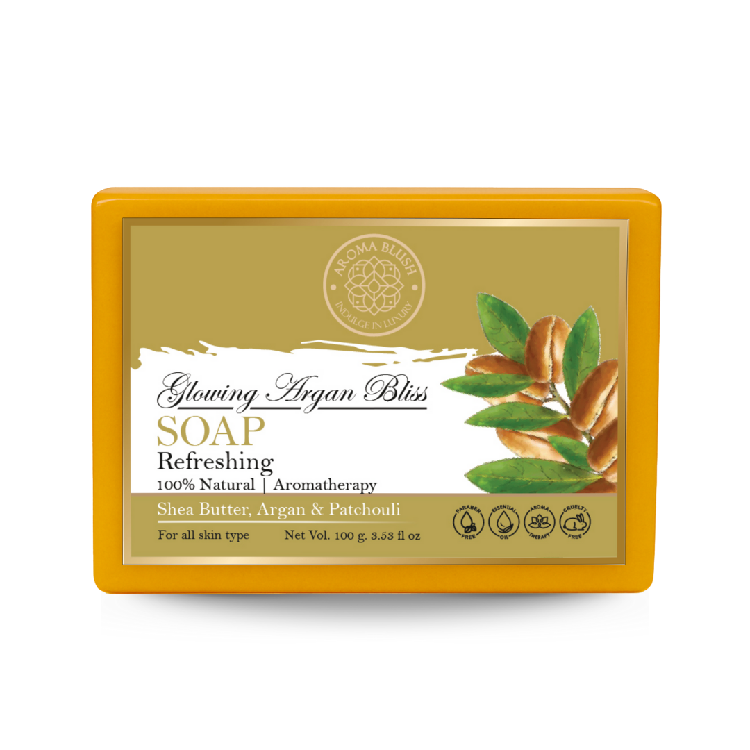 Introducing Aromablush Glowing Argan Bliss Soap, a luxurious bar that transforms your daily cleansing routine into a nourishing spa experience. Enriched with the hydrating properties of Shea Butter, the rejuvenating benefits of Argan Oil, and the earthy aroma of Patchouli, this soap leaves your skin glowing and beautifully scented.