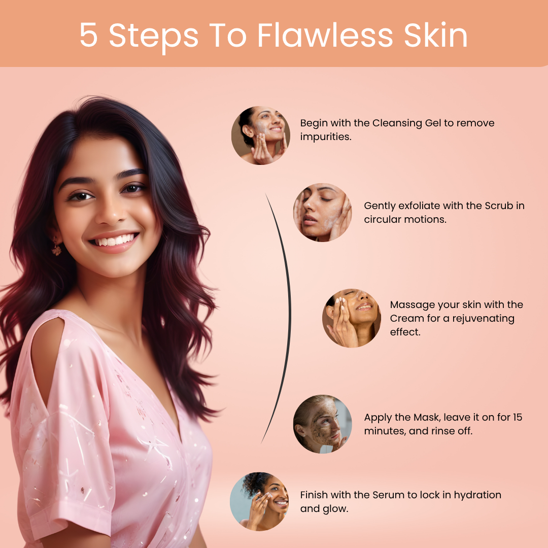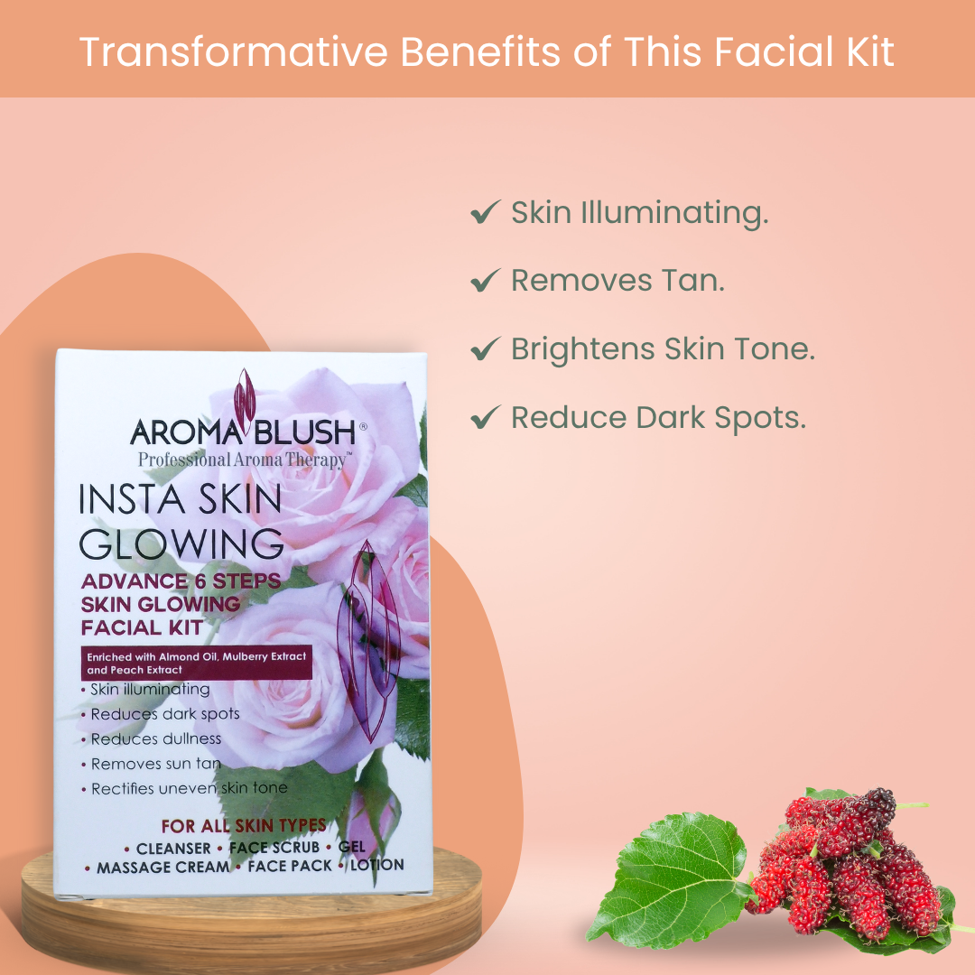 Need a glow-up in minutes? The AromaBlush Insta Glow Facial Kit is your perfect at-home solution for achieving salon-like radiance. Suitable for all skin types, this 6-step facial is enriched with Almond Oil, Mulberry Extract, and Peach Extract — a powerful blend that deeply hydrates, brightens, and rejuvenates tired, dull skin. Whether you’re prepping for an event, an important meeting, or simply want to glow effortlessly, this kit delivers instant brightness, smooth texture, and a refreshed complexion — all in a single use.