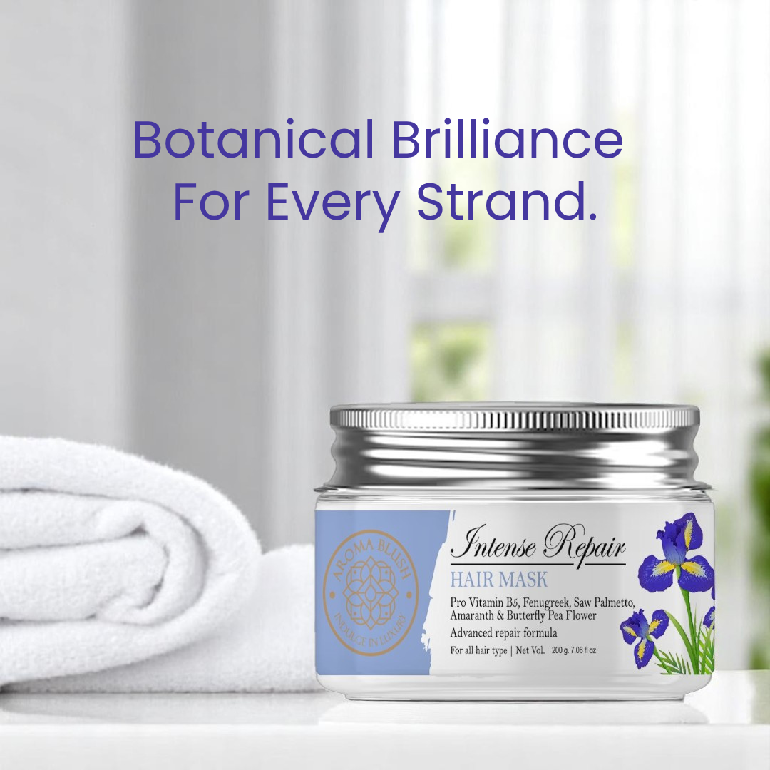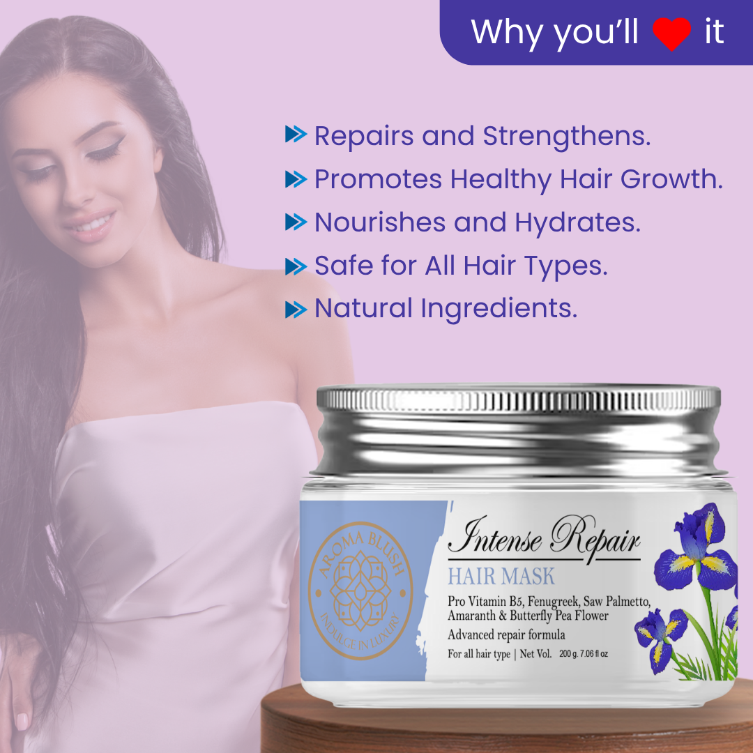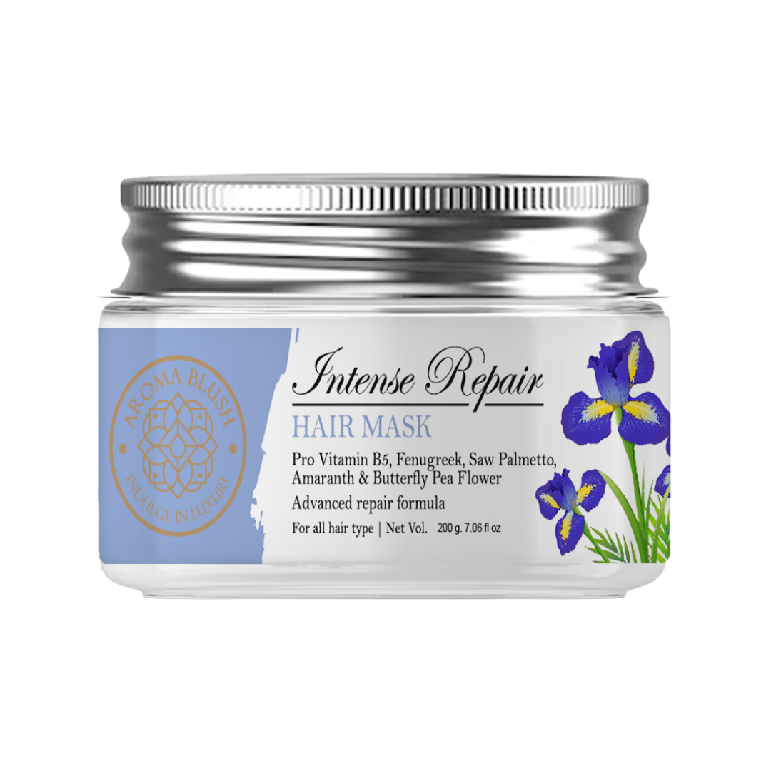 Introducing the Aromablush Intense Repair Hair Mask—your ultimate solution for dry, damaged hair. Enriched with Pro Vitamin B5, Fenugreek, Saw Palmetto, Amaranth, and Butterfly Pea Flower, this intensive treatment nourishes, repairs, and rejuvenates your hair from the root to the tip, leaving it healthy, vibrant, and full of life.