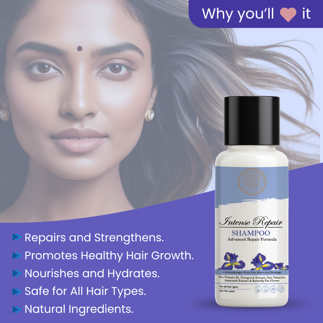 Revitalize and repair damaged hair with the nourishing power of Aromablush Intense Repair Shampoo. This shampoo is expertly formulated with Pro Vitamin B5, fenugreek, saw palmetto, amaranth, and butterfly pea flower to restore strength, shine, and vitality to your hair. Ideal for those dealing with hair breakage, thinning, or dullness, this powerful formula deeply nourishes the scalp, repairs damaged strands, and promotes healthy, thick hair growth.
