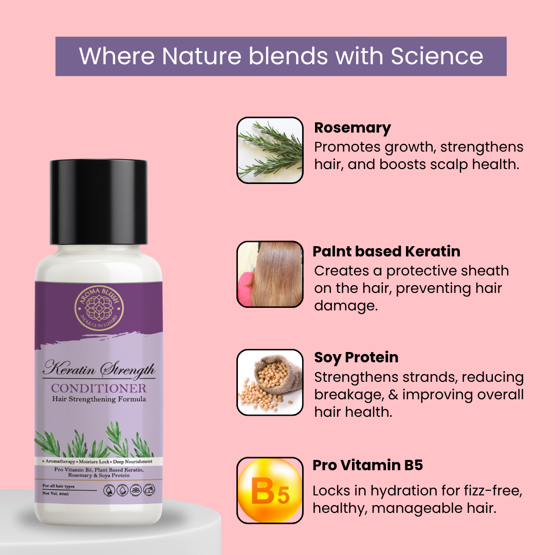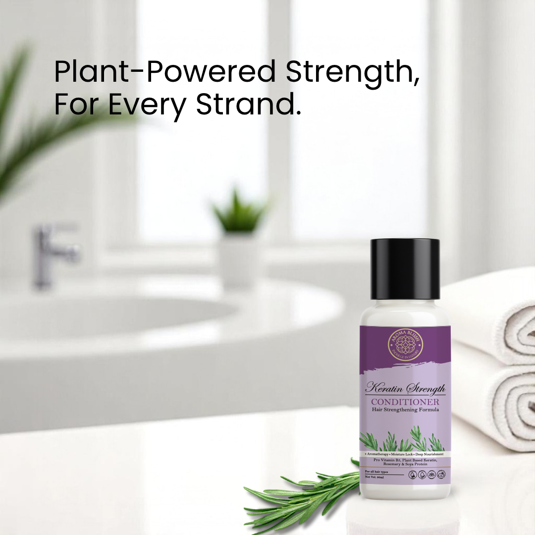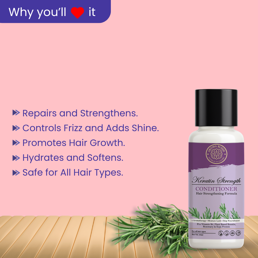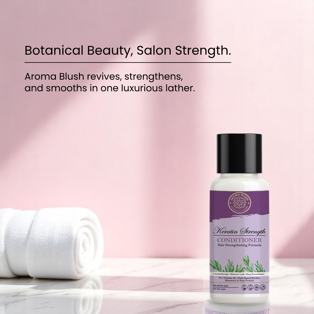 Discover the secret to strong, healthy hair with the Aromablush Keratin Strengthening Conditioner. Formulated with Pro Vitamin B5, Plant-Based Keratin, Rosemary, Soya Protein, and Vitamin E, this luxurious conditioner is designed to nourish, strengthen, and protect your hair from damage while providing deep hydration and shine.