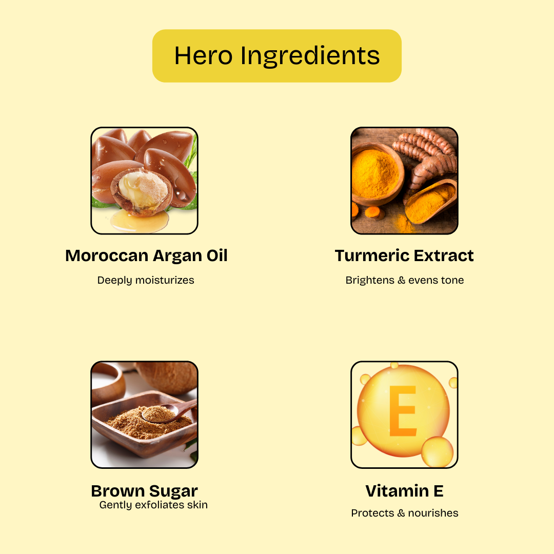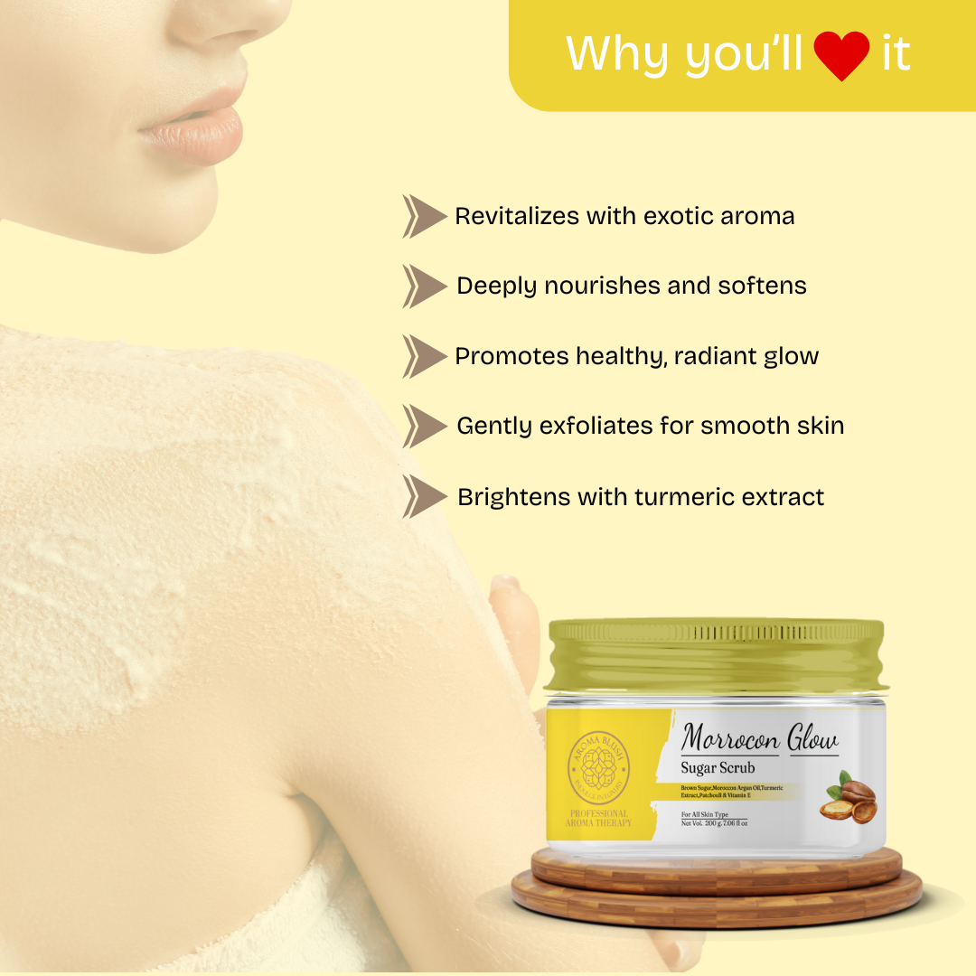 Reveal radiant, silky-smooth skin with AROMABLUSH Moroccan Glow Sugar Scrub. Powered by the brightening touch of turmeric, the nourishing goodness of Moroccan argan oil, and the calming aroma of patchouli, this luxurious exfoliator buffs away dead skin cells while deeply hydrating and rejuvenating your skin.Indulge in a luxurious skincare ritual with our exotic blend of Moroccan argan oil and turmeric. Designed to pamper, protect, and illuminate, this scrub offers not just exfoliation but deep hydration and a radiant finish. Perfect for self-care enthusiasts seeking an authentic spa-like glow at home.
