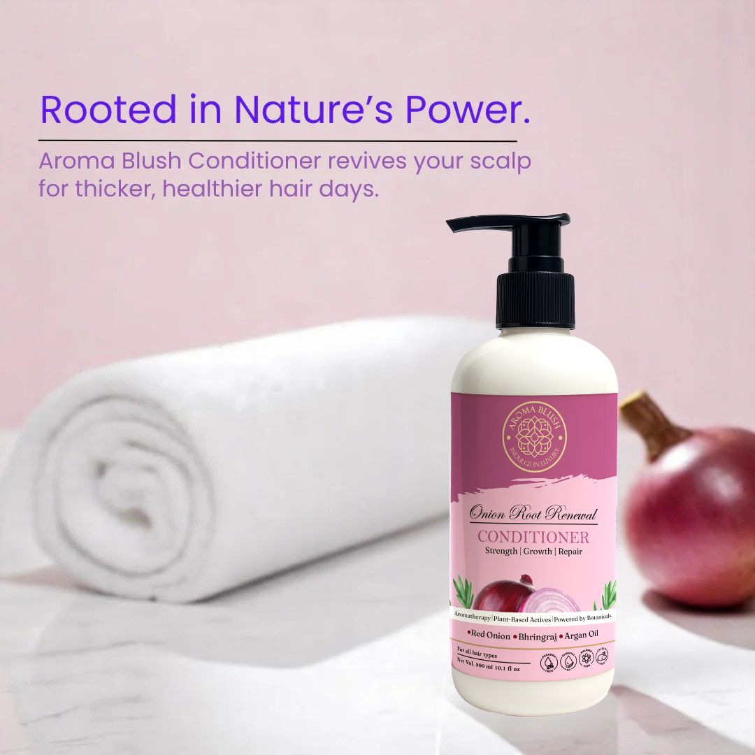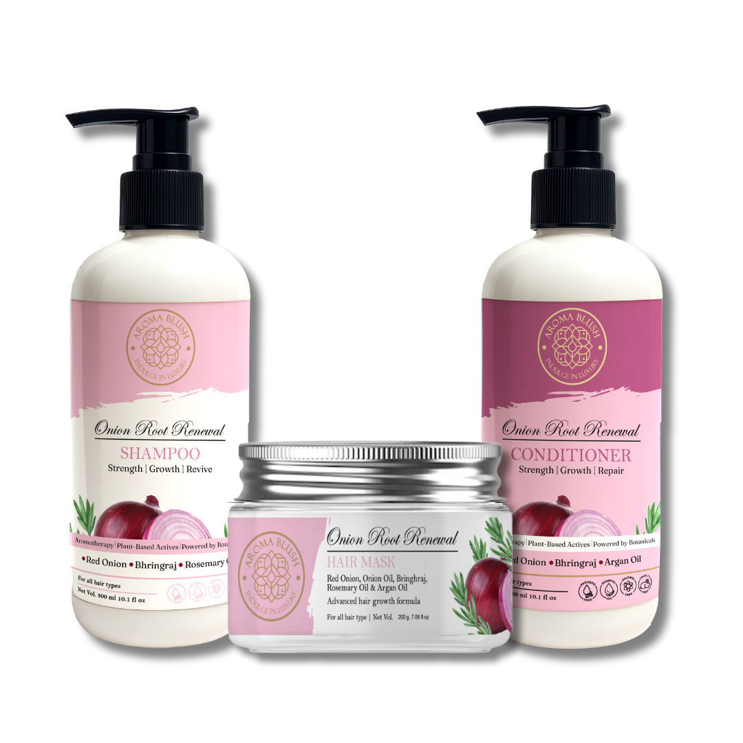 Unleash the strength of your roots with AromaBlush Onion Root Renewal Hair Care Range – a holistic trio designed to target hair fall, dryness, and scalp fatigue from the root up. Enriched with onion extract, plant-based keratin, lavender, and botanical oils, this combo revives hair strands, soothes the scalp, and boosts natural growth without harsh chemicals.