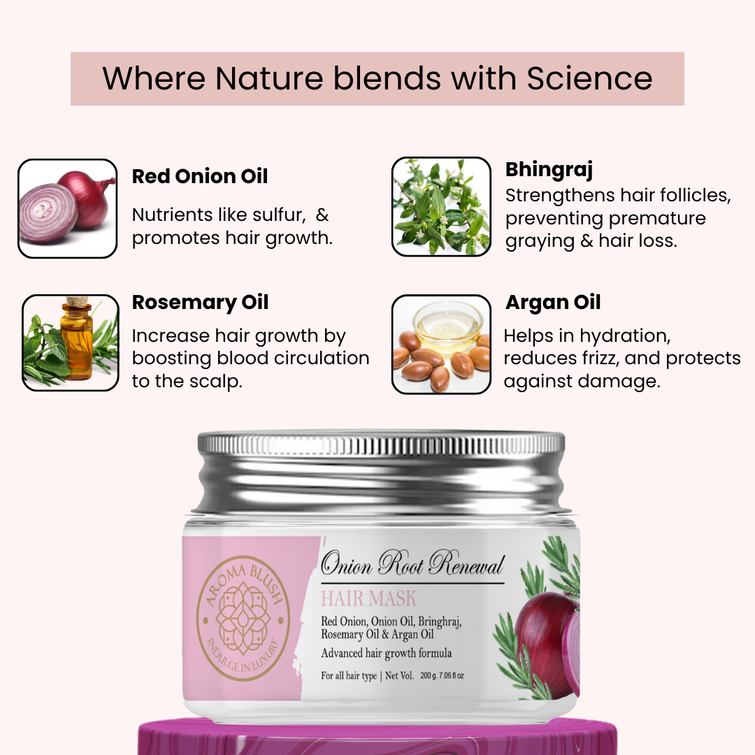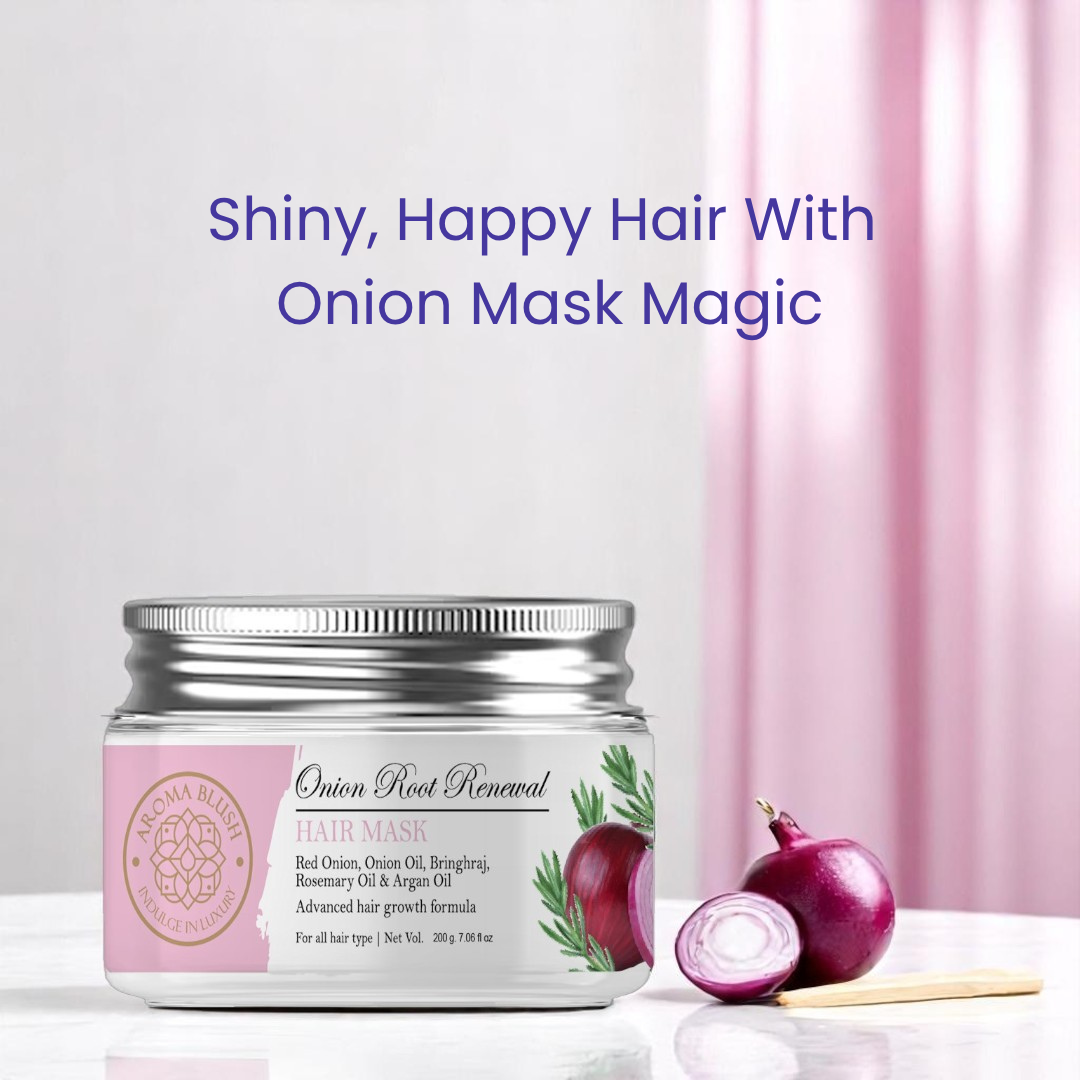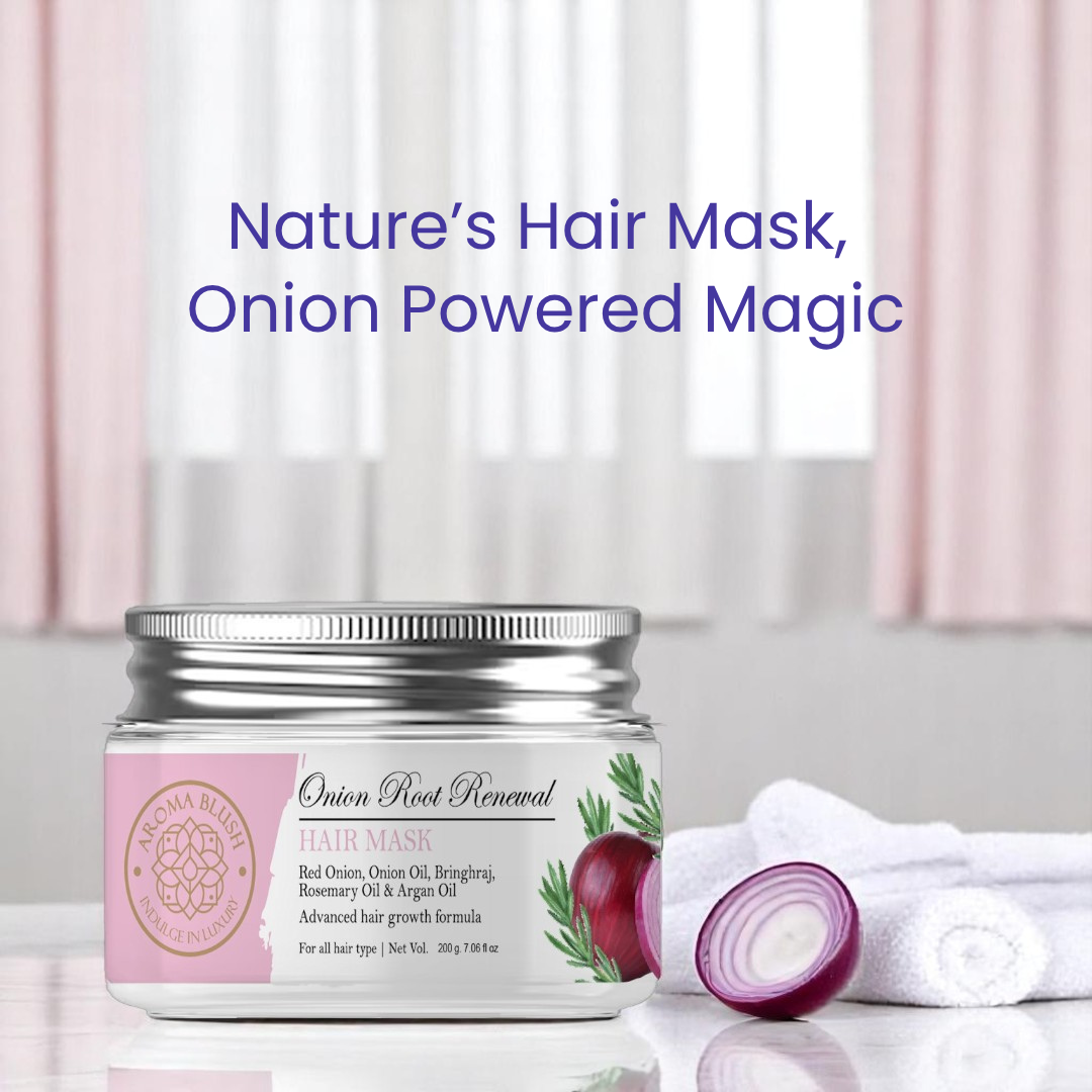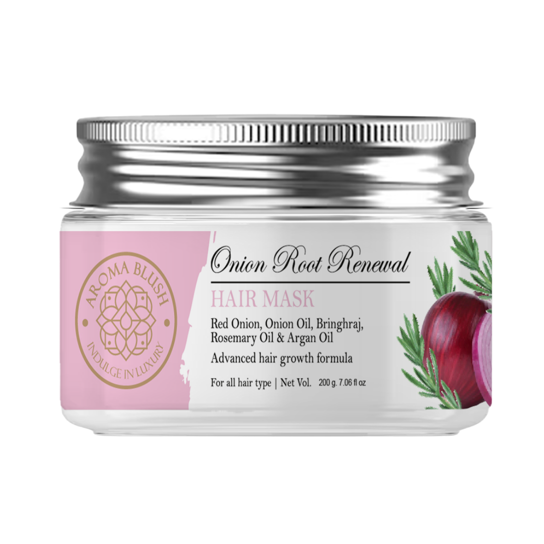 Introducing the Aromablush Onion Root Renewal Hair Mask, a luxurious hair treatment designed to restore vitality and strength to your hair. Infused with a powerful blend of Red Onion, Onion Oil, Bhringraj, Rosemary Oil, and Argan Oil, this hair mask works diligently to promote hair growth, reduce hair loss, and enhance shine, leaving your hair looking and feeling revitalized.