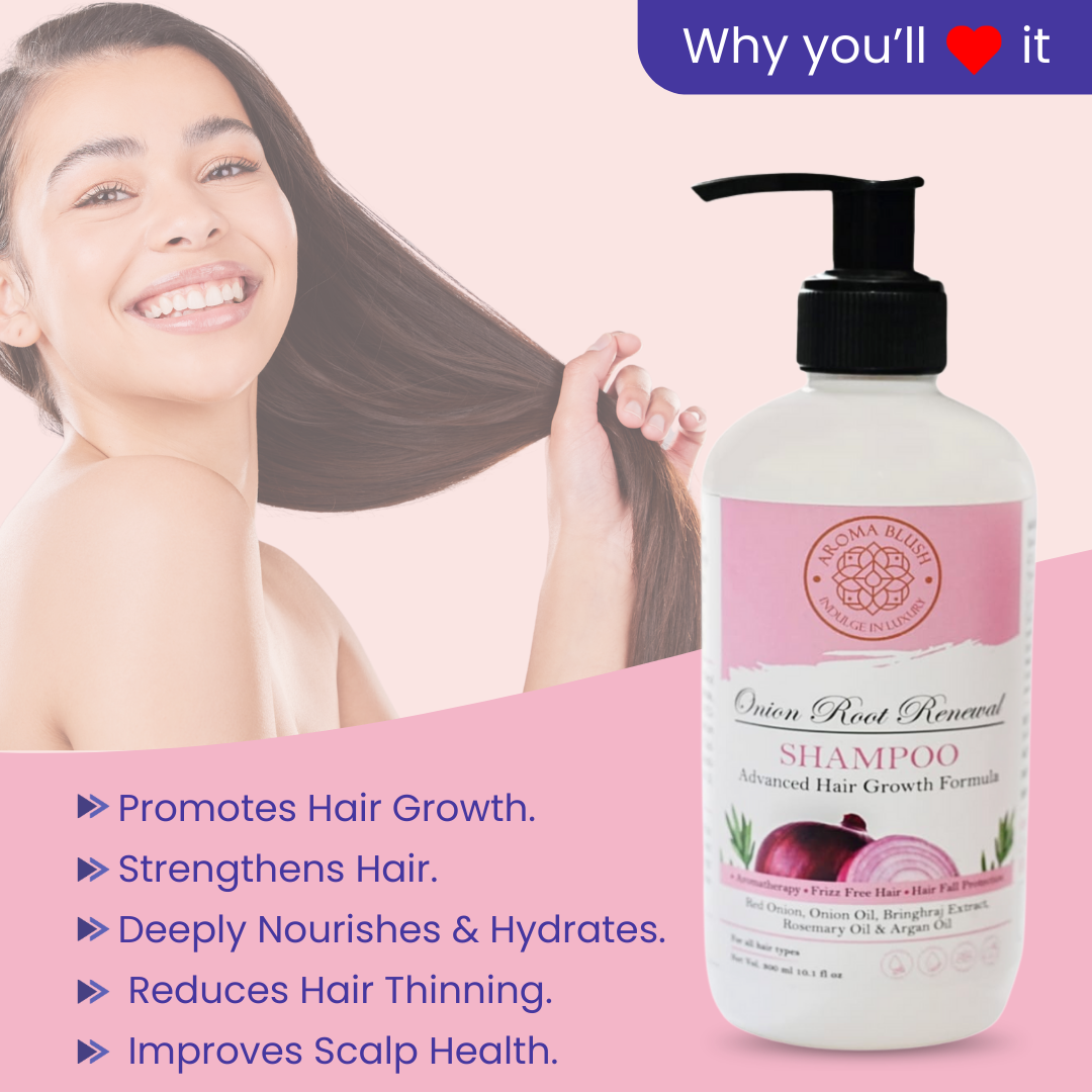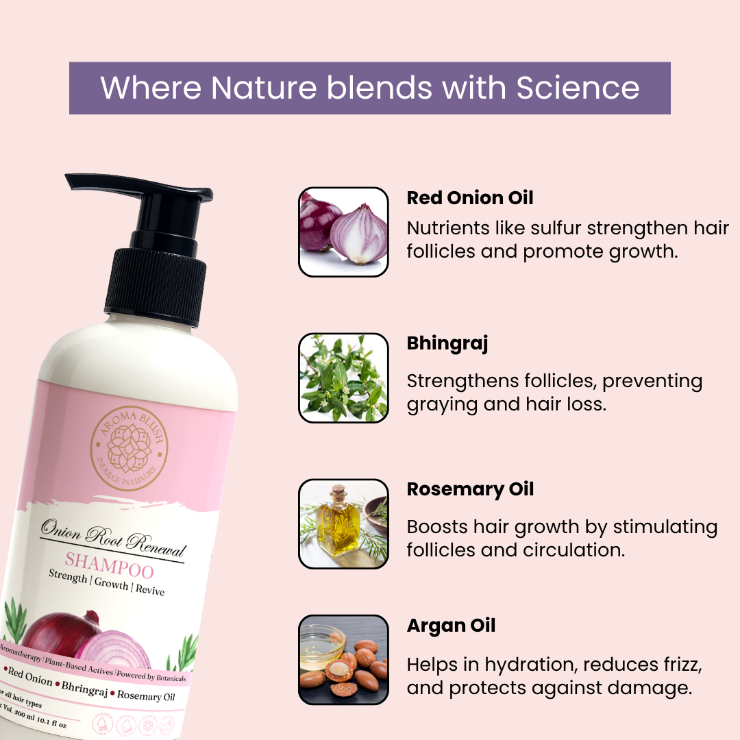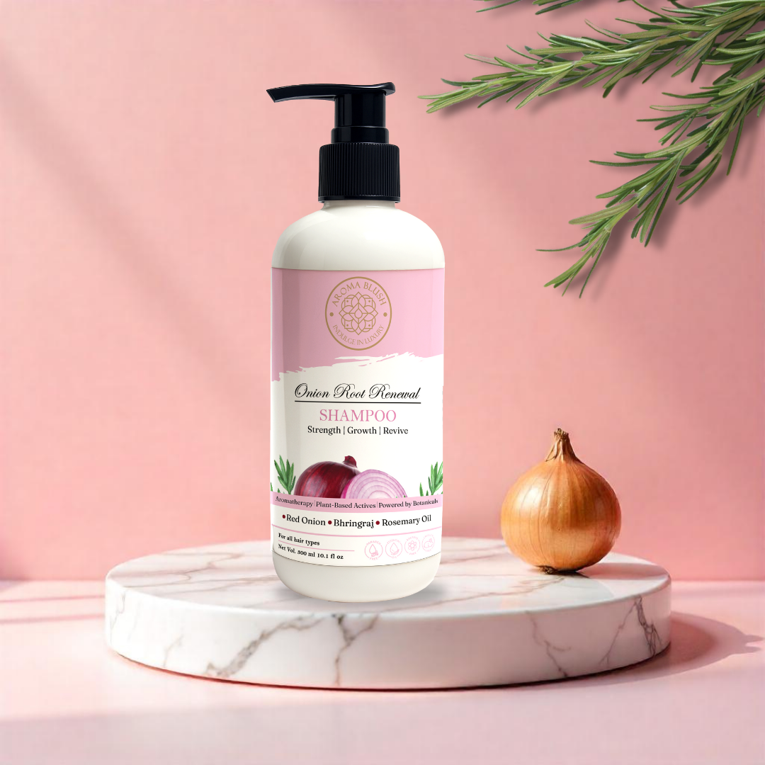 Discover the power of nature with Aroma Blush Onion Root Revival Shampoo, a specially formulated blend designed to nourish, strengthen, and revitalize your hair from root to tip. Enriched with Red Onion Extract, Onion Oil, Bhringraj, Rosemary Oil, and Argan Oil, this shampoo targets hair fall, promotes growth, and restores natural shine, giving you healthy, resilient hair. With its unique combination of antioxidant-rich ingredients and essential nutrients, this shampoo helps to deeply cleanse the scalp, stimulate blood circulation, and fortify hair roots, reducing breakage and hair thinning. Ideal for all hair types, Aroma Blush Onion Root Revival Shampoo is sulphate-free, paraben-free, and made with high-quality, natural ingredients for a gentle, effective cleansing experience.