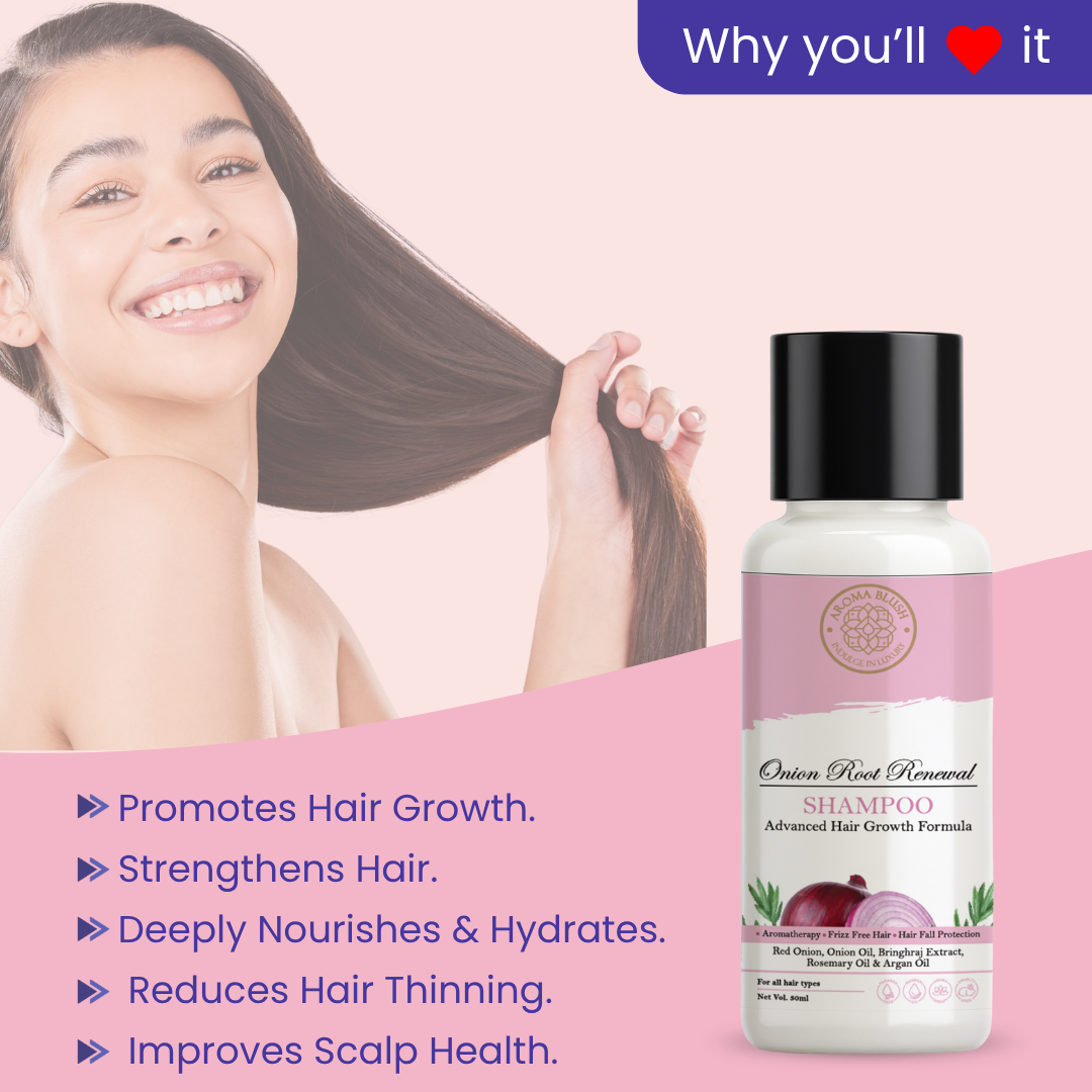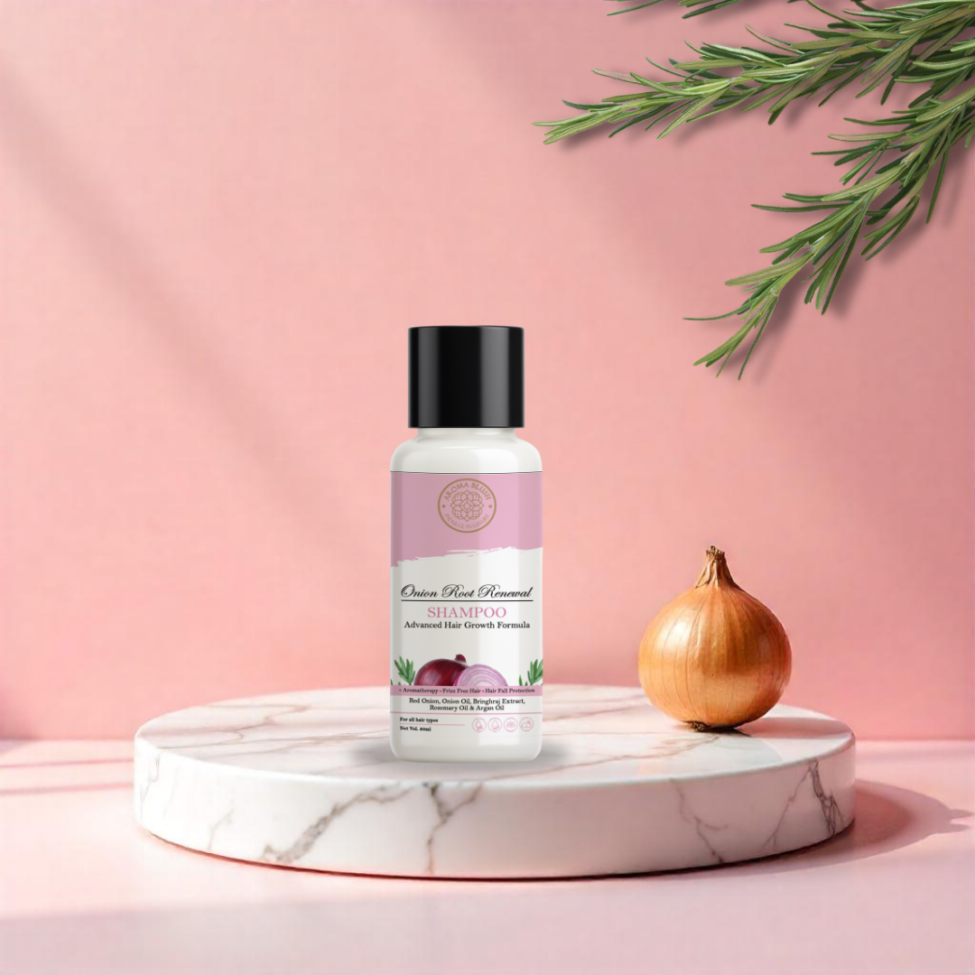 Discover the power of nature with Aroma Blush Onion Root Revival Shampoo, a specially formulated blend designed to nourish, strengthen, and revitalize your hair from root to tip. Enriched with Red Onion Extract, Onion Oil, Bhringraj, Rosemary Oil, and Argan Oil, this shampoo targets hair fall, promotes growth, and restores natural shine, giving you healthy, resilient hair. With its unique combination of antioxidant-rich ingredients and essential nutrients, this shampoo helps to deeply cleanse the scalp, stimulate blood circulation, and fortify hair roots, reducing breakage and hair thinning. Ideal for all hair types, Aroma Blush Onion Root Revival Shampoo is sulphate-free, paraben-free, and made with high-quality, natural ingredients for a gentle, effective cleansing experience.