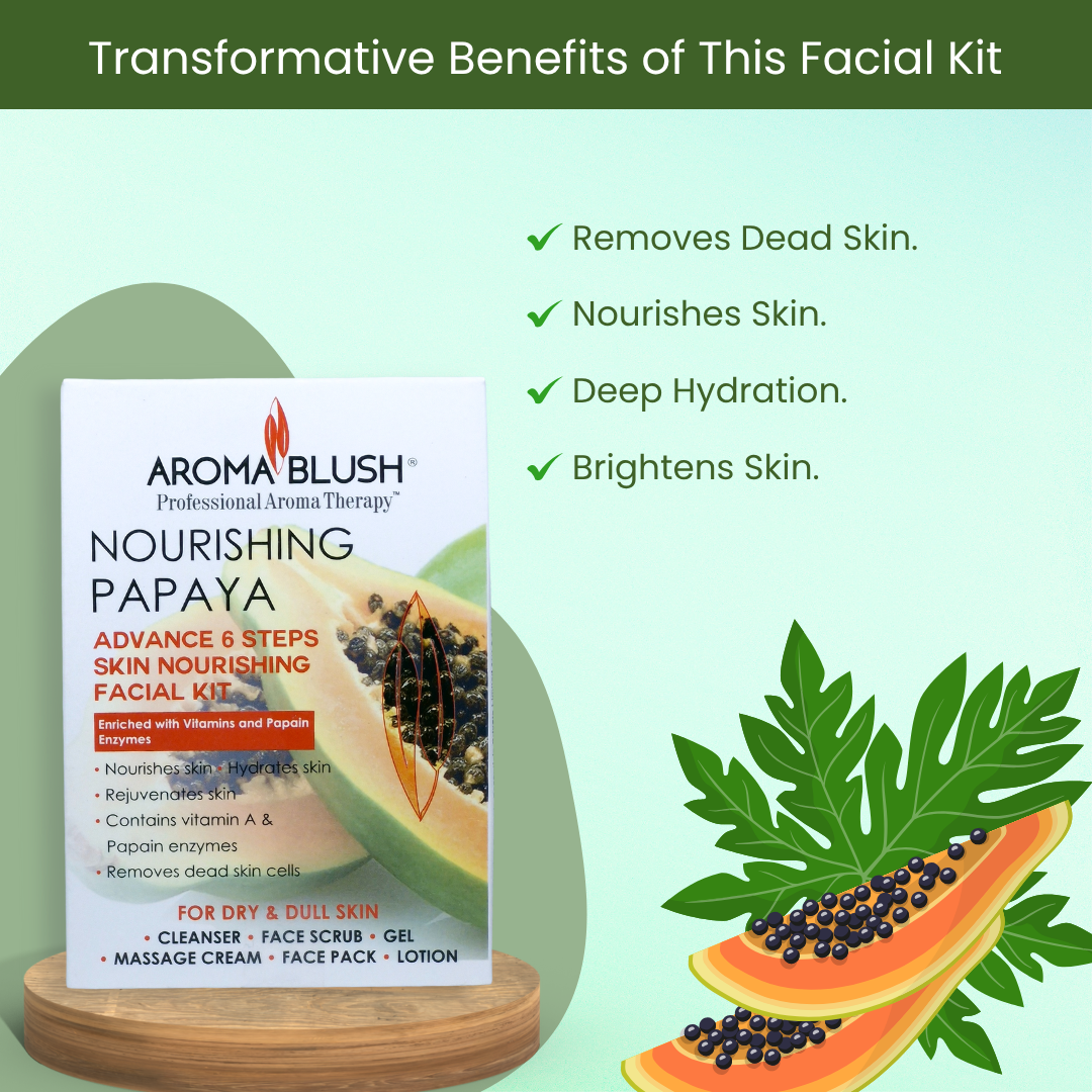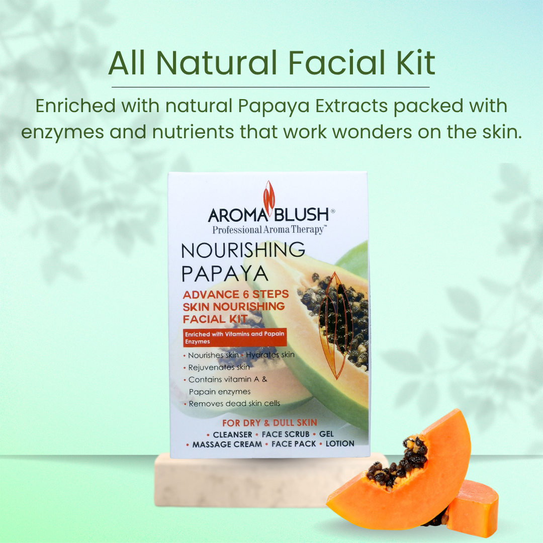 Rejuvenate your skin with the AromaBlush Nourishing Papaya Facial Kit—a luxurious 6-step facial treatment that harnesses the natural power of Papaya Extracts, Vitamins, and Papain Enzyme. This kit deeply cleanses, gently exfoliates, and nourishes your skin from within.