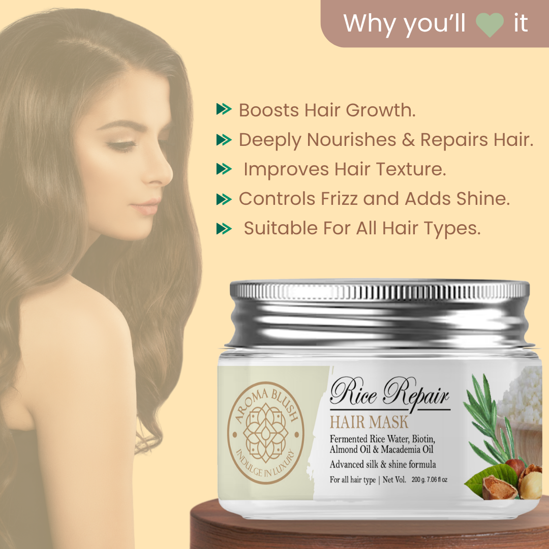 Discover the power of nature with the Aromablush Rice Repair Hair Mask. Formulated with Fermented Rice Water, Biotin, Almond Oil, and Macadamia Oil, this luxurious hair mask is designed to repair, strengthen, and hydrate your hair, leaving it soft, shiny, and manageable.