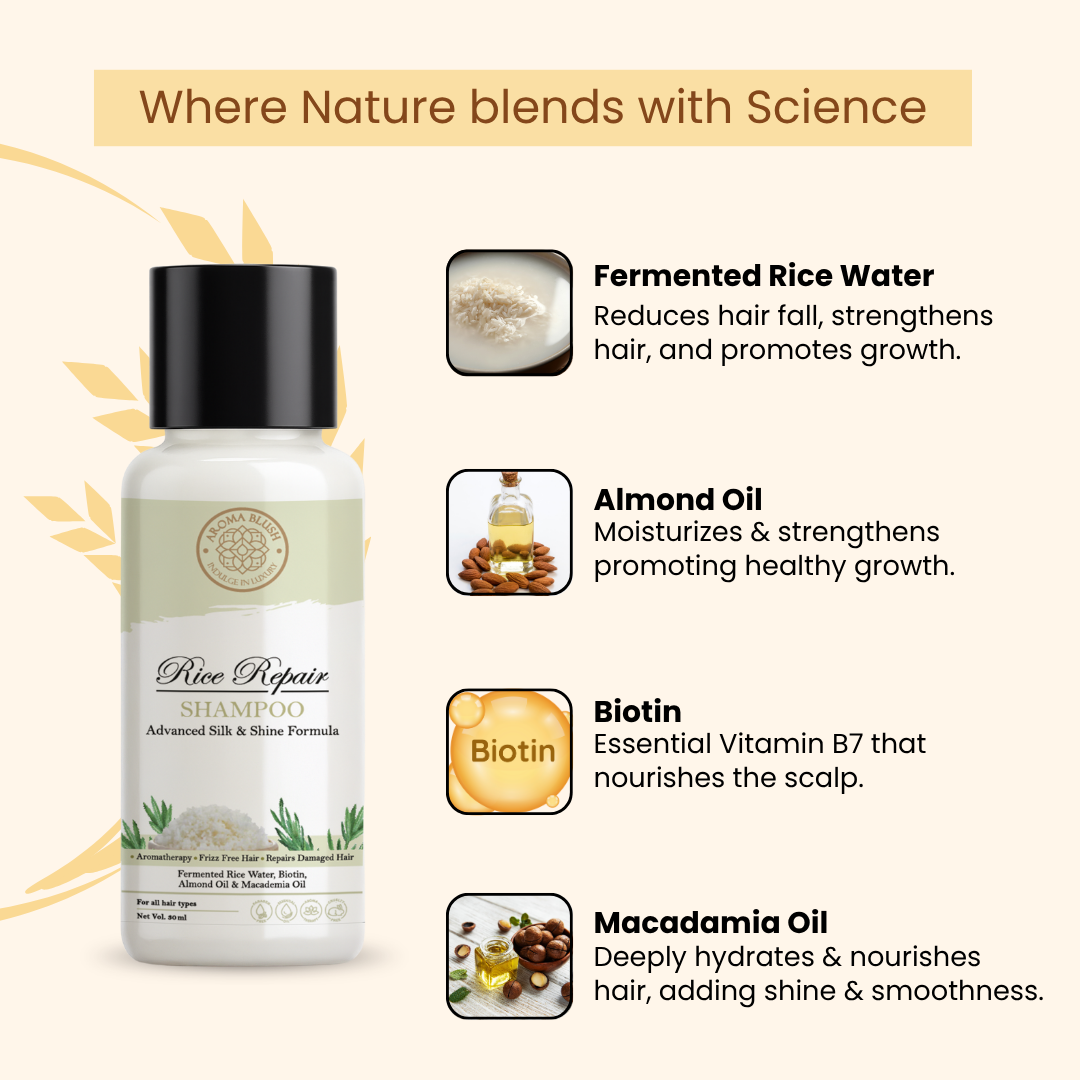 Discover the power of ancient beauty secrets with Aroma Blush Fermented Rice Shampoo. Infused with the goodness of fermented rice water, biotin, almond oil, and macadamia oil, this nourishing shampoo is specially formulated to strengthen your hair, boost hair growth, and enhance shine. Ideal for all hair types, this shampoo deeply hydrates, repairs damaged strands, and leaves your hair feeling soft, smooth, and lustrous. Rejuvenate your hair naturally with every wash!