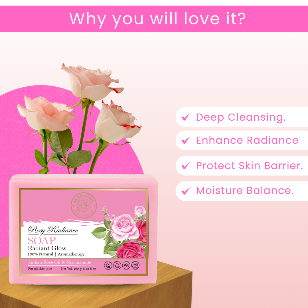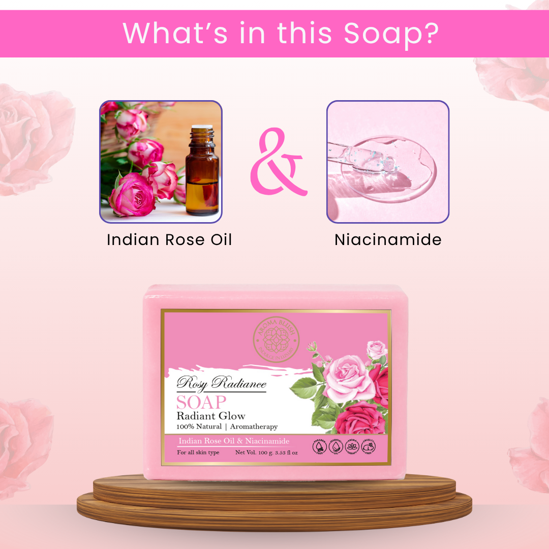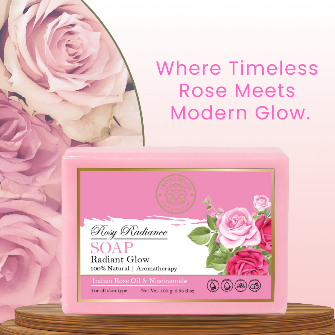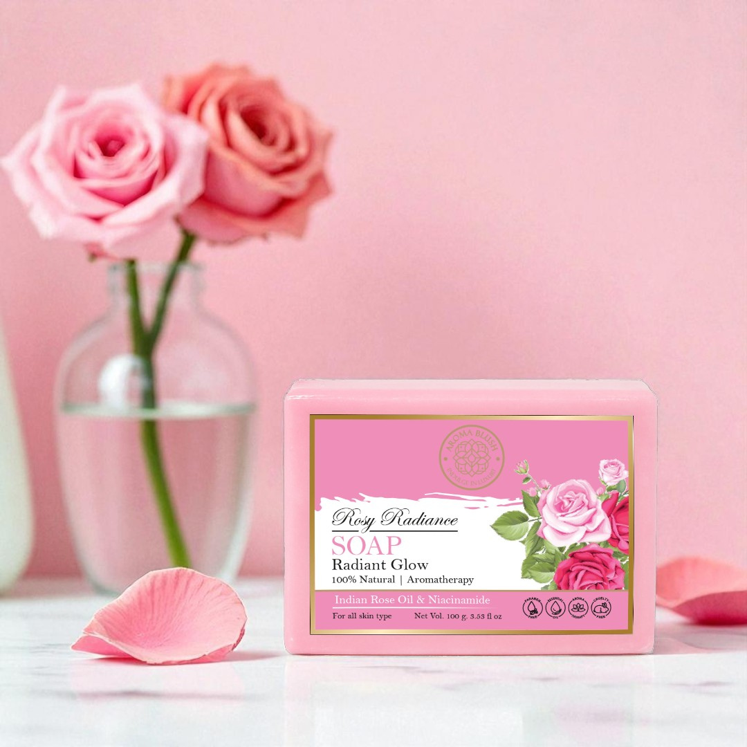 Indulge in the luxurious blend of Indian Rose and Niacinamide with Aromablush Rosy Radiance Soap. This handmade soap gently cleanses while nourishing your skin, helping to enhance softness and promote a radiant, healthy glow. Its delicate floral scent offers a soothing sensory experience, making every wash a moment of pure indulgence.