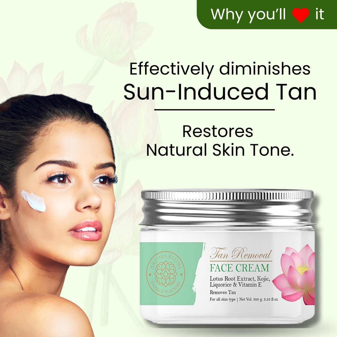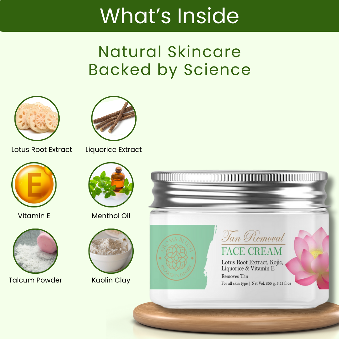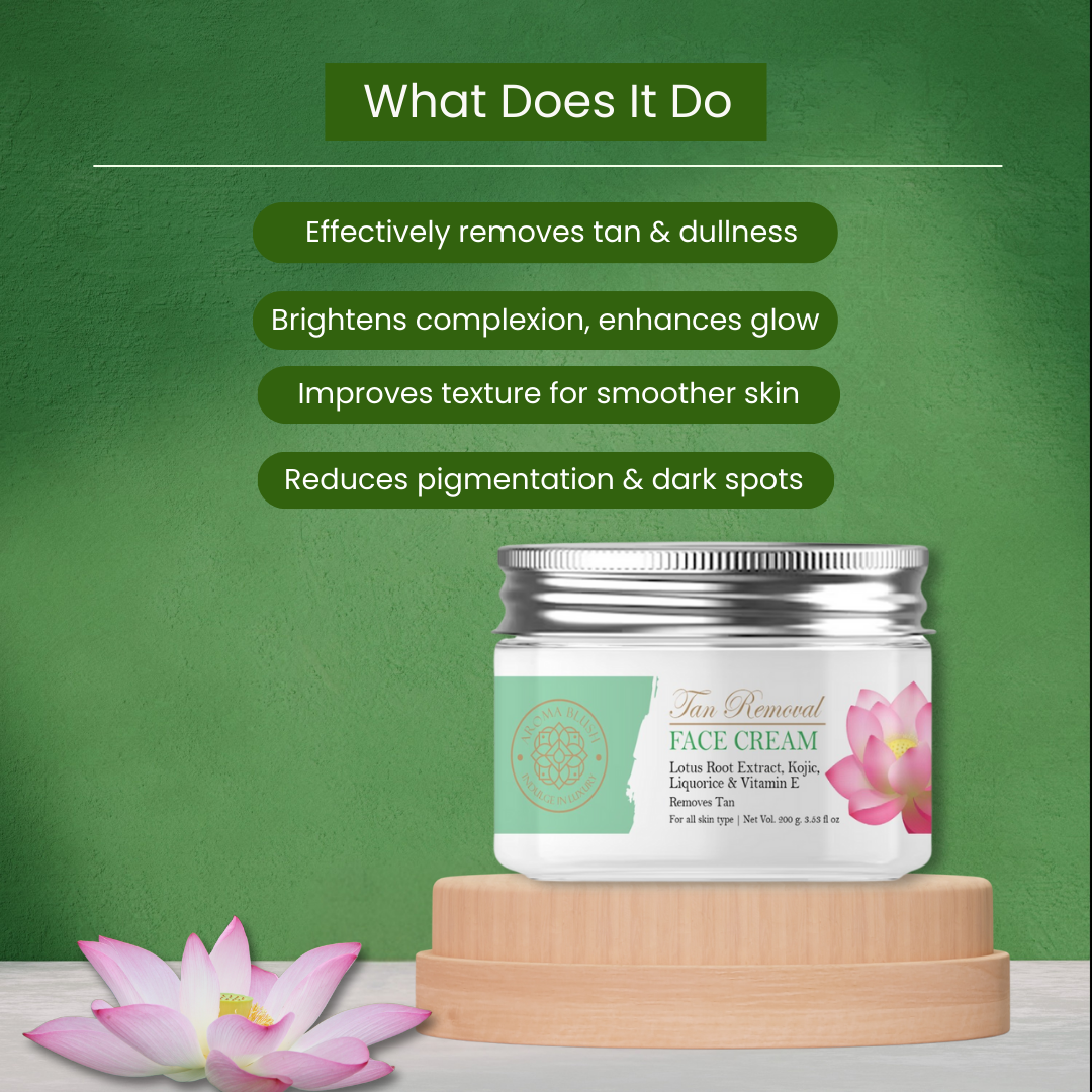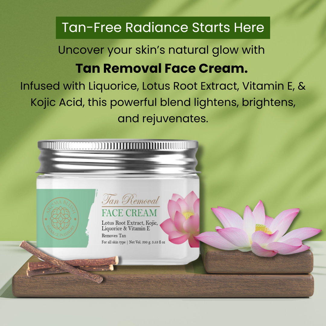 Say goodbye to stubborn tan and reveal your true radiance with our Tan Removal Face Cream! Enriched with the potent combination of Liquorice, Lotus Root Extract, Vitamin E, and Kojic Acid, this cream is designed to lighten, brighten, and rejuvenate your skin. Suitable for all skin types, our lightweight, non-greasy formula ensures your skin stays nourished, even-toned, and protected from further sun damage. Embrace your natural beauty and let your skin shine!