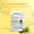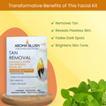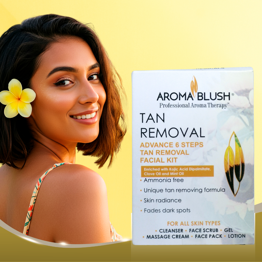 Uneven skin tone, sun damage, and tanning can dull your natural glow—but not anymore. The AromaBlush Tan Removal Facial Kit is a 6-step, one-time-use skincare ritual that helps reverse sun tan, refresh tired skin, and restore your natural radiance. Enriched with Kojic Acid Dipalmitate, Clove Oil, and Mint Oil, this salon-style facial kit is designed to deeply cleanse, exfoliate, detoxify, and cool the skin, giving you a brighter, smoother, and more even-toned complexion in just one use.